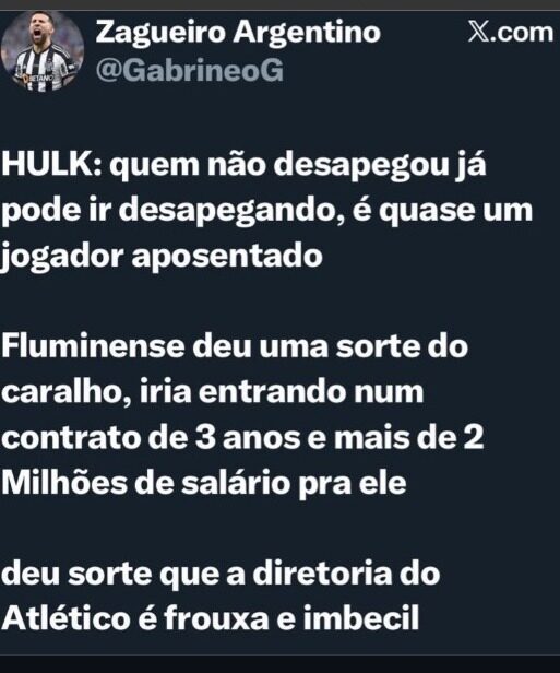 Como podemos ver abaixo, Hulk acabou sendo atacado por torcedores do clube que é ídolo. Deste modo, o Time de Guerreiros obteve um “livramento” segundo alguns torcedores do Galo. E você, concorda torcedor?