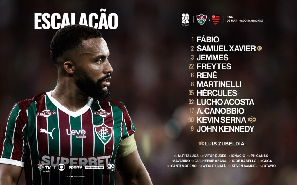A escalação do Fluminense para o clássico decisivo foi confirmada com Fábio no gol; a linha defensiva composta por Samuel Xavier, Jemmes, Freytes e Renê. No setor intermediário, o treinador optou pela solidez de Martinelli e Hércules, que terão a missão de dar suporte ao meia Lucho Acosta na articulação das jogadas. O ataque tricolor terá o retorno de A. Canobbio ao lado de Kevin Serna, servindo o centroavante John Kennedy, que assume a responsabilidade de comandar a ofensiva no Maracanã.