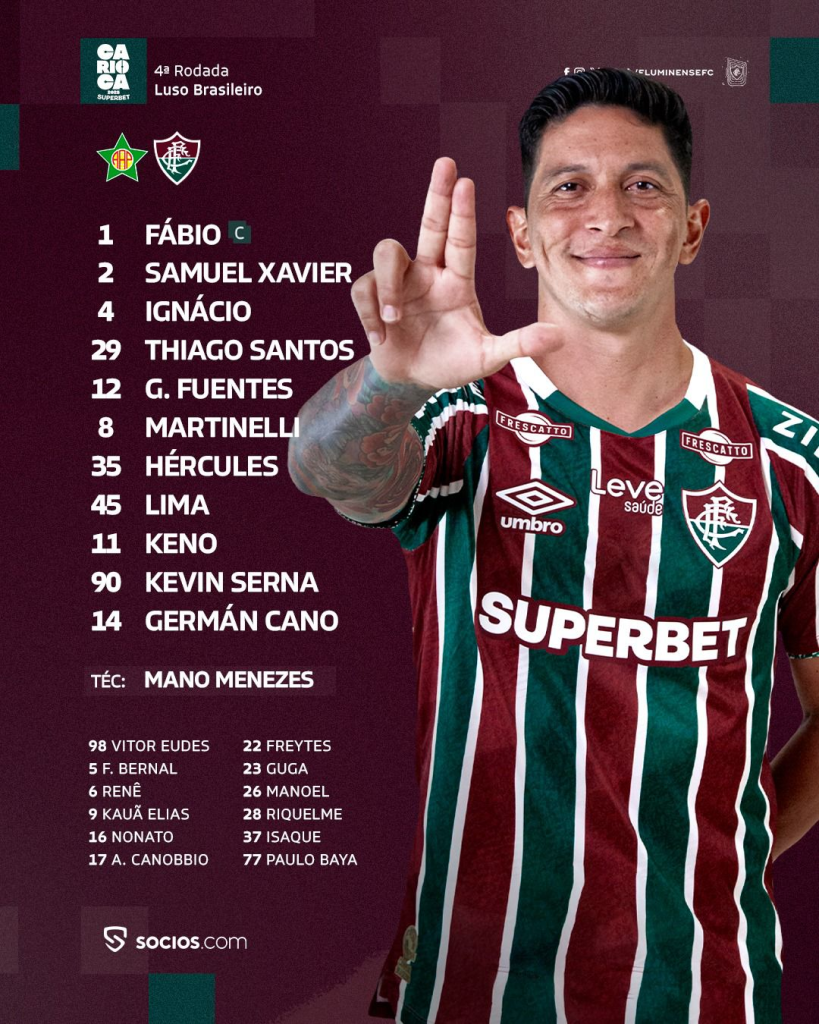 O Fluminense enfrentará a Portuguesa daqui a pouco, às 21h30, em jogo que será disputado no estádio Luso Brasileiro, na Ilha do Governador. E o Tricolor das Laranjeiras terá a estreia de seu 01, Germán Cano, na atual temporada. Ele inicia como centroavante do time principal, deixando Kauã Elias como opção no banco de reservas.