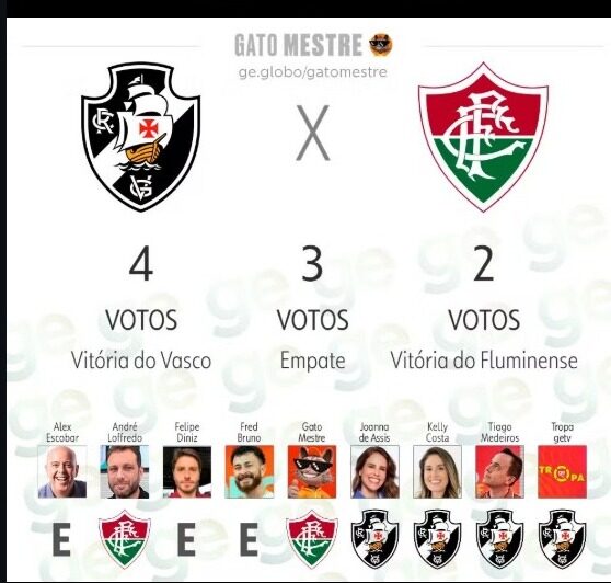 Porém, o Tricolor das Laranjeiras segue sendo muito menosprezado por conta da imprensa esportiva, que coloca novamente o Vasco como favorito no clássico de hoje, mesmo com o Time de Guerreiros vivendo um bom momento na atual temporada. Só Loffredo e Gato Mestre apostaram no Flu vencendo a partida de hoje.