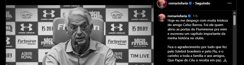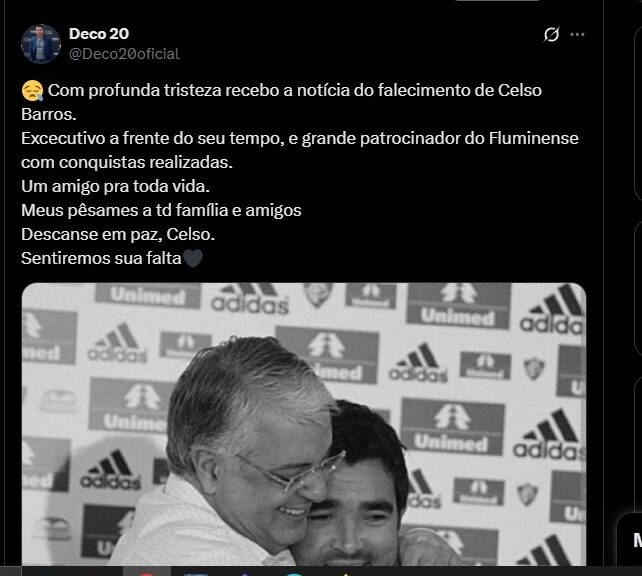 Porém, o time tricolor lamenta a morte de Celso Barros, dirigente e patrocinador histórico do FFC e um grande tricolor de coração. Celso foi vítima de um infarto fulminante e acabou sucumbindo aos 73 anos de idade. Porém, o que se viu foi uma grande rede de apoio e mensagens de personalidades lendárias, como Deco, Renato Gaúcho, Romário e afins.
