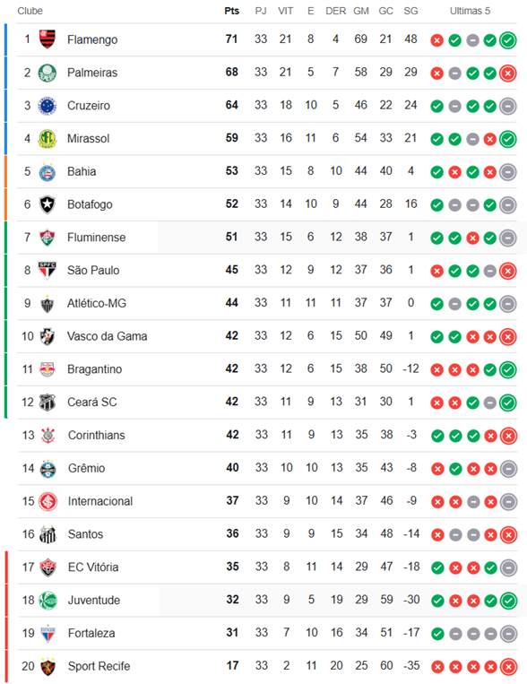 Enquanto o Fluminense luta no meio de cima, a ponta da tabela pegou fogo. O Palmeiras foi derrotado pelo Santos na Vila Belmiro e estacionou nos 68 pontos. Quem aproveitou foi o Flamengo, que goleou o Sport por 5 a 1 e assumiu a liderança isolada com 71 pontos, abrindo três de vantagem para o rival paulista.