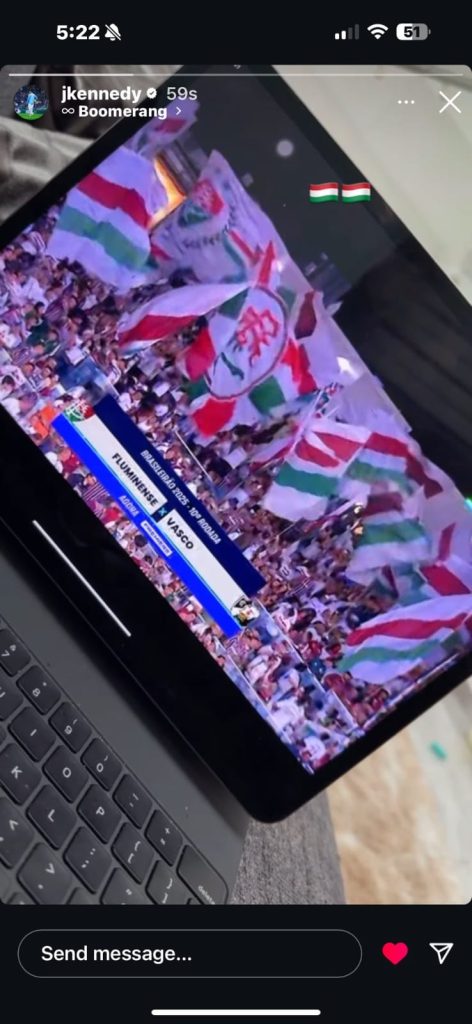 Mesmo longe dos gramados brasileiros, John Kennedy segue ligado no Fluminense. O atacante, que atualmente está jogando no Pachuca-MEX, publicou vídeos assistindo à vitória tricolor por 2 a 1 sobre o Vasco, na noite de ontem, no Maracanã, pela 10ª rodada do Brasileirão. As postagens viralizaram e levantaram suspeitas sobre uma possível reaproximação entre o jogador e o clube.