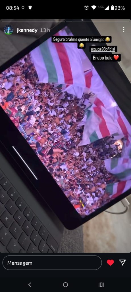 Nas imagens divulgadas nos stories do Instagram, John Kennedy mostrou o momento da entrada dos times e das bandeiras tricolores balançando na arquibancada. Além disso, reagiu com bom humor à atuação de Guga, autor do gol da virada. “Segura Brahma quente aí, amigão”, escreveu o atacante, marcando o lateral com emojis e elogios: “Brabo bala”.